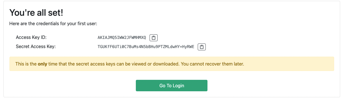 - Follow the steps to create an initial administrator user. Save the credentials you’ve received somewhere safe, you won’t be able to see them again!
